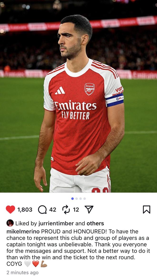 梅里诺在Instagram上写道:“无比自豪,也深感荣幸!今晚能有机会以队长身份代表球队出战,感觉太不可思议了。感谢所有人的留言与支持。没有比一场胜利和晋级下一轮,更能完美开启这段经历的方式了。”